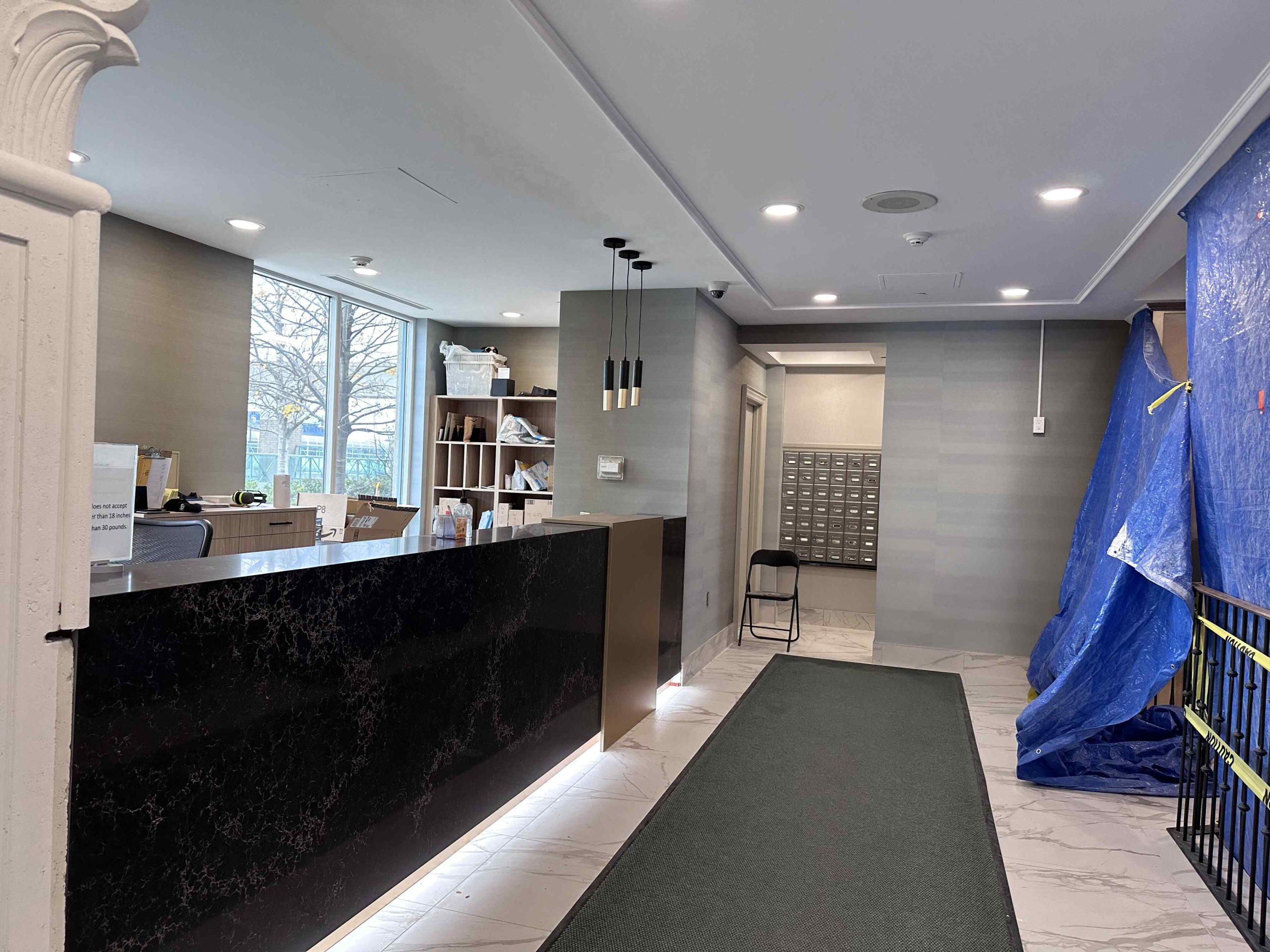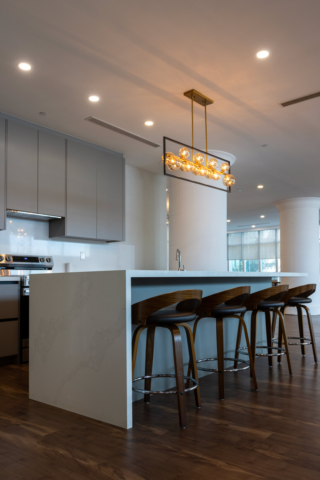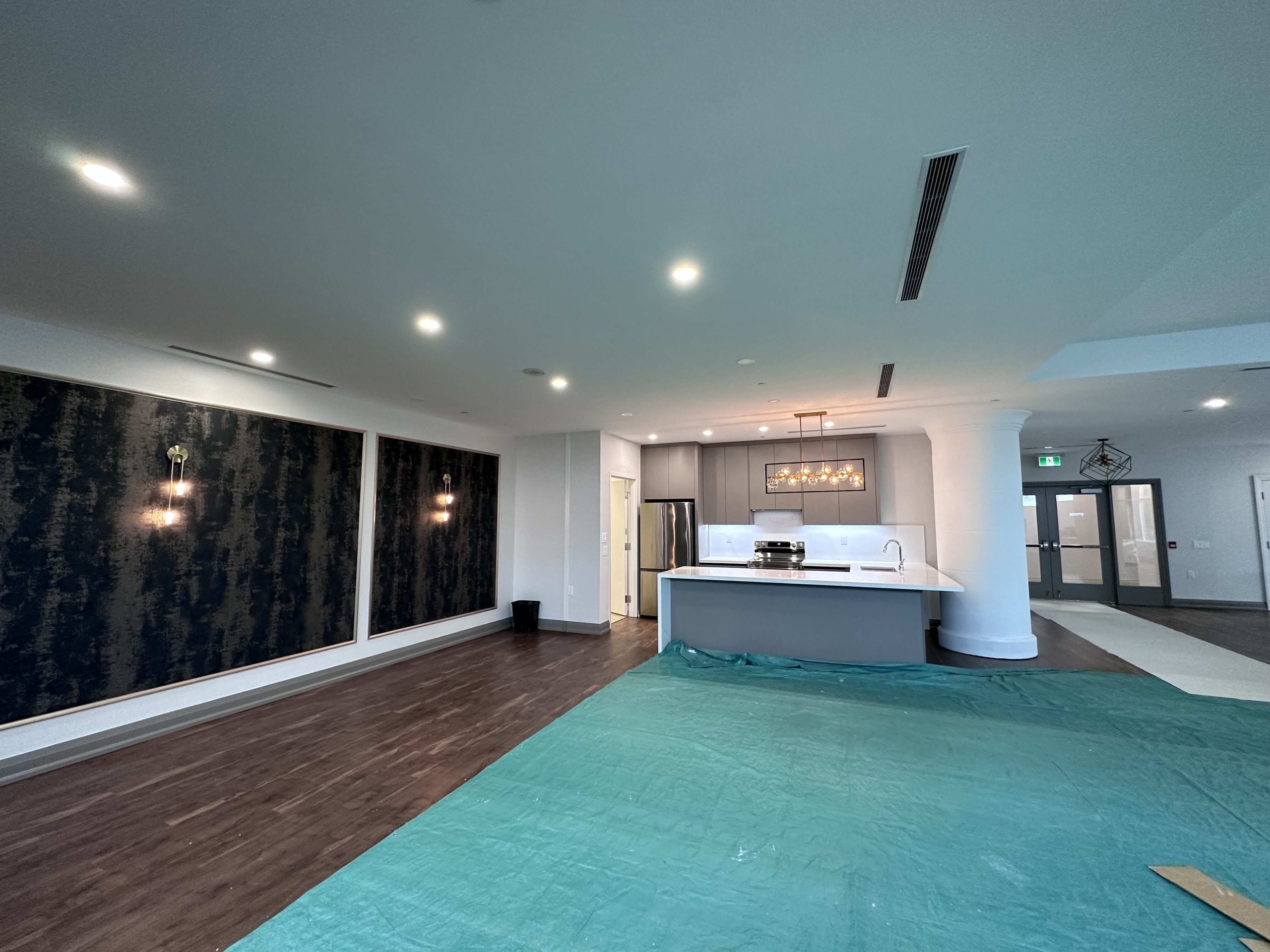Design and fabrication of a custom concierge desk and a fully equipped kitchen for the party room.