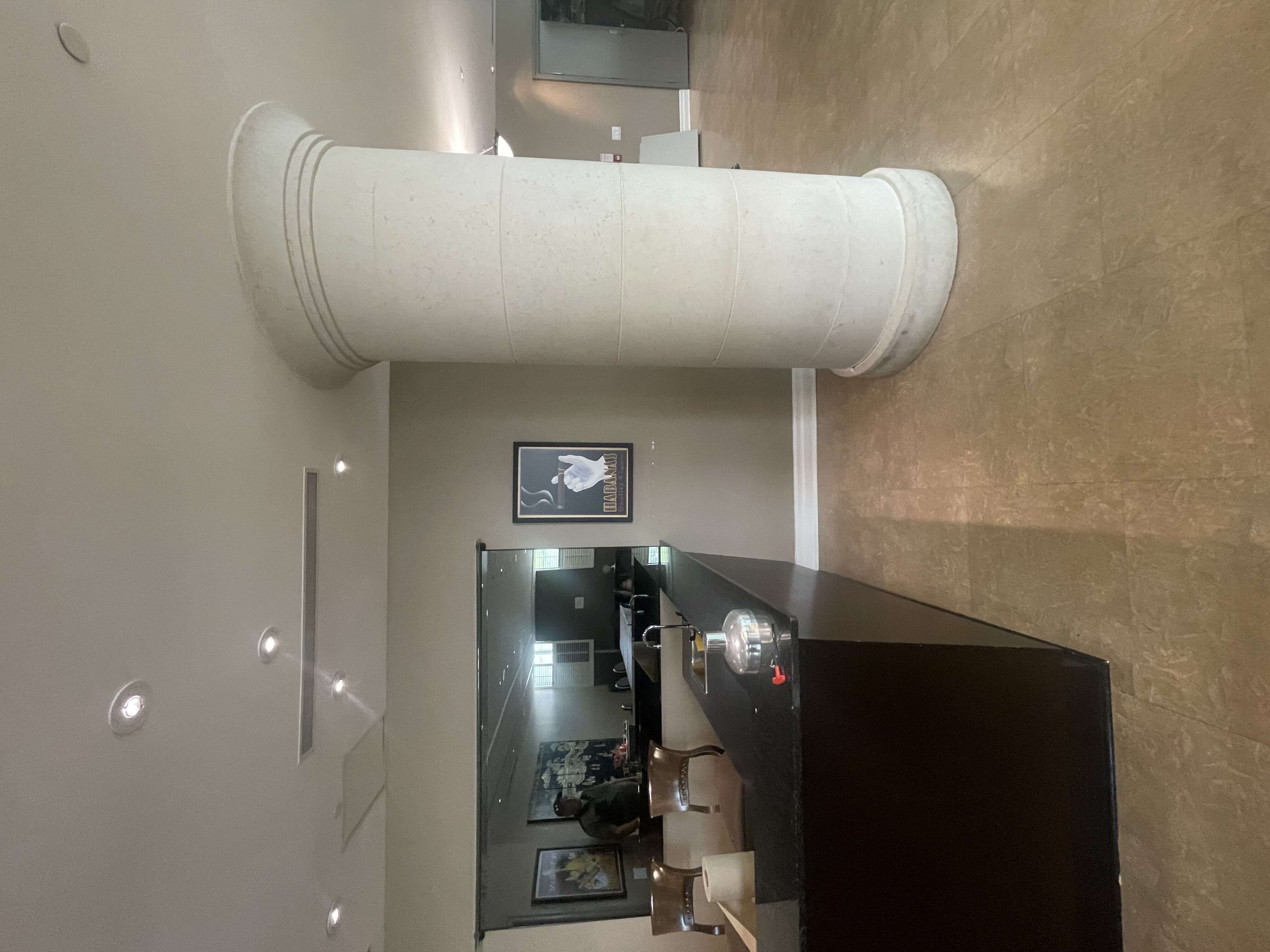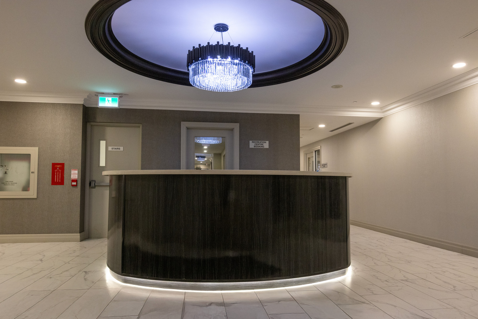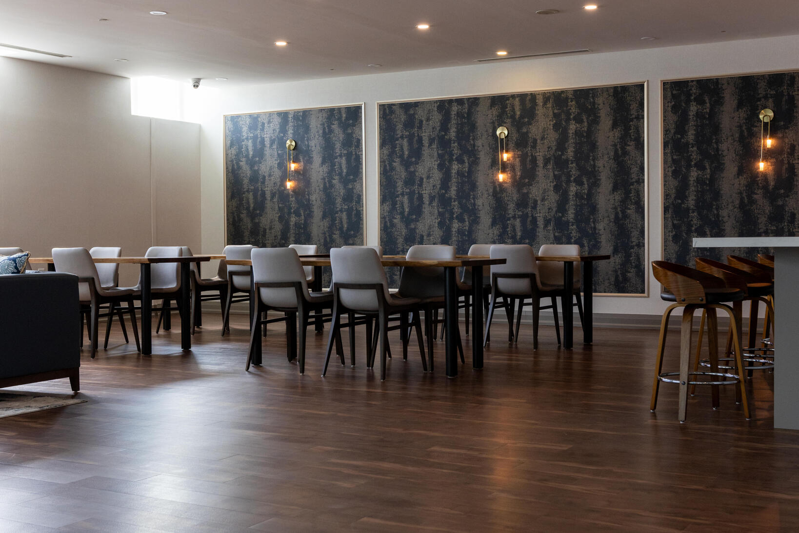 Design and fabrication of a custom concierge desk and a fully equipped kitchen for the party room.